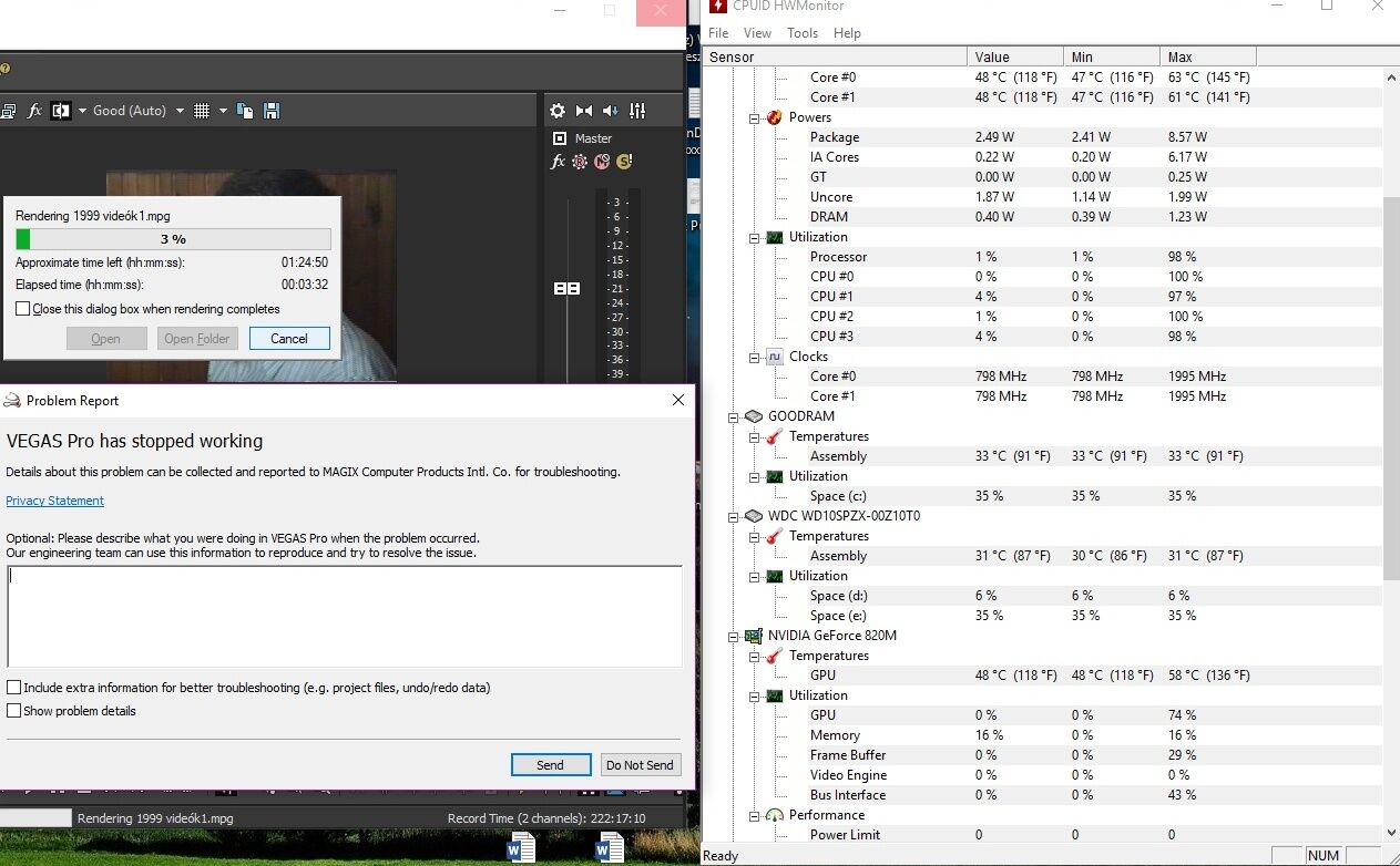 Sony Vegas 16 build(361) írtam feljebb vagy lejebb hogy ezt használom most és,hogy összeomlások terén még ez az ami tartja magát úgyahogy,viszont van egy probléma van egy 4:30 órás videó ami egy mixhez van igazitva renderelésnél ha pl WMA-ba 1giga lett volna a video,renderelem 16%ék és meg áll a prewiev ablakban a kép és úgy is marad az idök végezetéig ha úgy hagynám viszont az idő számláló pörög,gondoltam én na majd átrakom akkor valami másik formátumba betoltam neki egy másikat ezzel foglalt volna a video 5giga környékén itt már 8%nál megállt és maradt is úgy de olyan szinten mint elöbb,na mondom akkor MP4 ez is olyan 1giga lett volna 15%nál meg áll és kész,kiprobáltam,hogy ha onnan kezdek renderelni ahol elötte megállt mit csinál hát olyan szépen elindul mint az álom persze szintén 16 vagy 8 esetleg 15%ig és ott megint beáll az egész mint a szög,én már kikapcsoltam mindent meg be (szerintem) de nem változik a tényállás,egyszer bállitottam hogy a renderelést ne mutatsa a prewieb ablakban na ekkor végig ment a renderelés