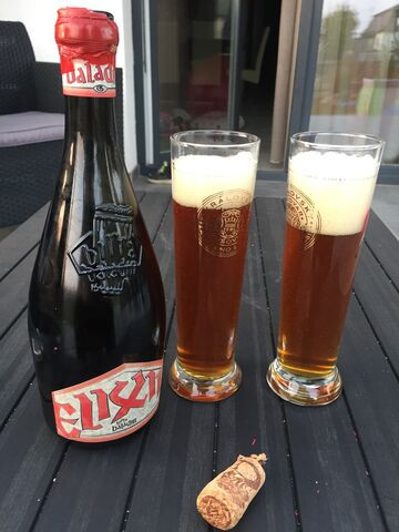 Megjöttek Biancáék. Aranypatkány fórumtárssal kezet foghatunk, az egyiken (pont a Rasberryes) aprócska lyukon spriccelt a nedű, szinte az egészet meg tudtam menteni, gyorsan kitöltöttem 2 pohárba és akkor már meg is kóstoltam. Te jó ég, teljesen elborult cucc, egyből jön a tömény gyümölcsorgia, bele az arcodba, támadás az ízlelőbimbóknak, aztán átmegy savanyúba és a végén a Marlenka sütire emlékeztető lecsengés (mézes-diós süti,nagyon szeretem). Első korty után hangosan felnevettem, család furcsán nézett rám, nálam betalált, iszonyat geil és tömény, de engem megvett