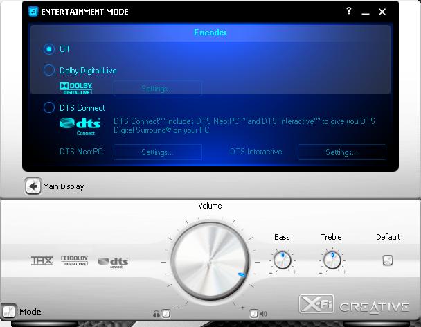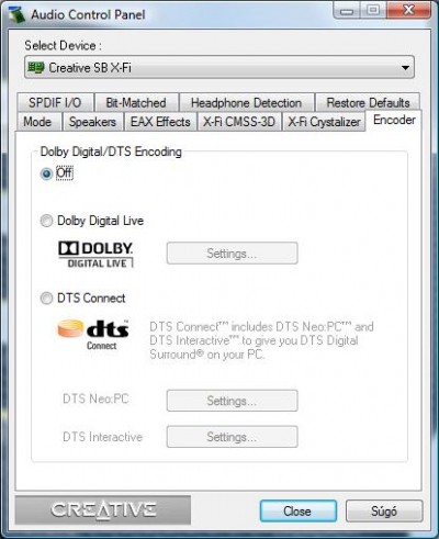 A funciót életre lehet kelteni bizonyos moddolt youp-pay driver-ekkel, nálam pl EZZEL működött az X-Fi Elite Pro kártyán Vista alatt is. Pedig a fenti link szerint az én kártyám hivatalosan nem is tudta. Van ITT egy leírás is, ami elvileg jó, de nálam v.miért nem működött.III.) DTS és DD Encoder (DD Live, DTS Connect)