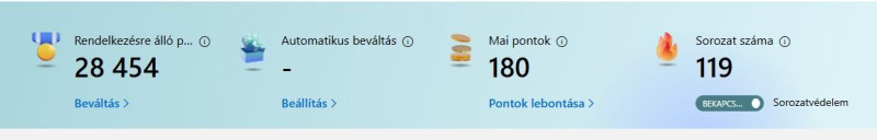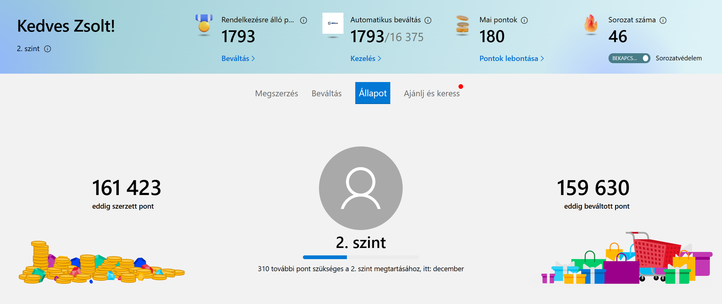Valamikor 2023-ban kezdtem, nem túl aktívan. Pontosan két éve kértem ki az első 5k-s utalványt. Azóta már komolyabban veszem, próbálok odafigyelni, persze így is sokszor elmarad pl. az app-os napi bejelentkezés, akkor meg már megszakad a széria és ugrik a bónusz. Jelenleg így állok [kép], múlt szombaton nulláztam le a pontjaim, ez azóta jött össze. Ezek [kép] meg az eddigi beváltások. Rosszul mondtam az előbb, csak 9-et váltottam be. De akkor is érdemes rászánni azt a napi pár percet szerintem. Szoktam még kérdőívezni is, van ahol pénzt utalnak, van ahol emag utalványt lehet kérni vagy PayPal utalást. De ebben már nem vagyok olyan kitartó, mint régen, sokat kihagyok