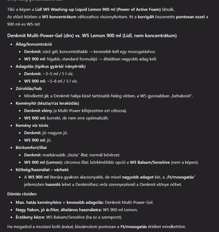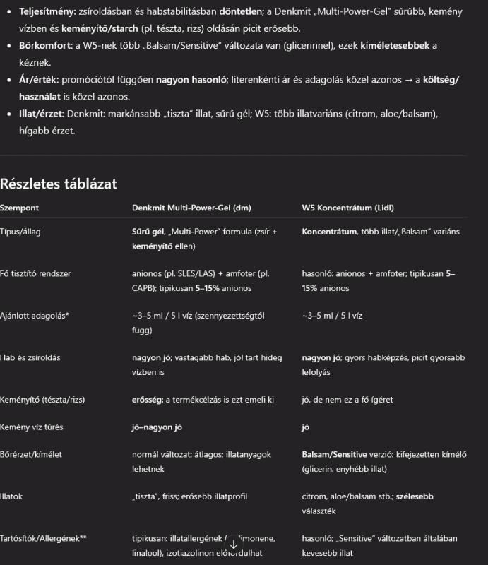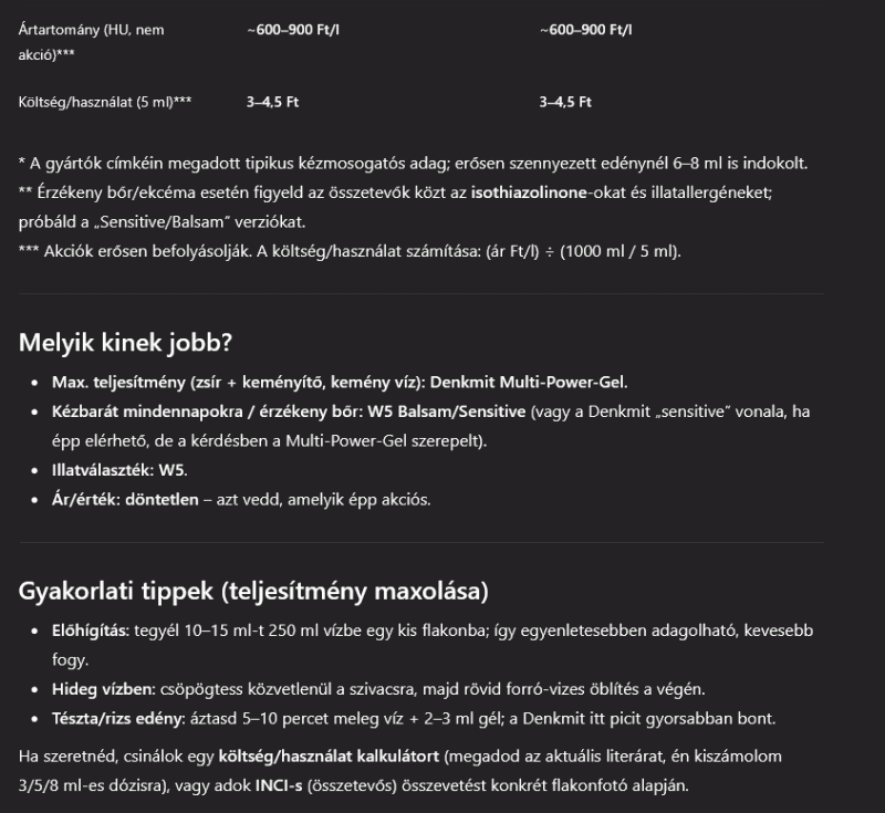 Ebben is egy dm-es ultrakoncentrált végzett az első helyen hatékonyságban, jar citrom a második, ez egybevág a tapasztalatommal, sokszor azt vettük mielőtt rászoktunk a denkmit multipowerre. Jar platinum is nagyon jó volt, amíg ki nem vezették.Mosogatógép mellett nem fogy olyan sok, de a családban többfelé szoktam kézzel mosogatni néha besegítésképpen a vasárnapi ebéd után, és rendszeres tapasztalom, hogy még a drágább termékek közül is mennyi a silány, és ezzel a dm-essel direktben összehasonlítva szinte mindegyik hígabb, gyengébb a zsíroldás, gyngébb a hab, irritáló a szag és van amelyik meg is marad az edényeken háromszori öblítés után stb. Vittem több helyre is a denkmitből, mondták hogy milyen jó, aztán ha elfogyott vettek valami mást (facepalm).