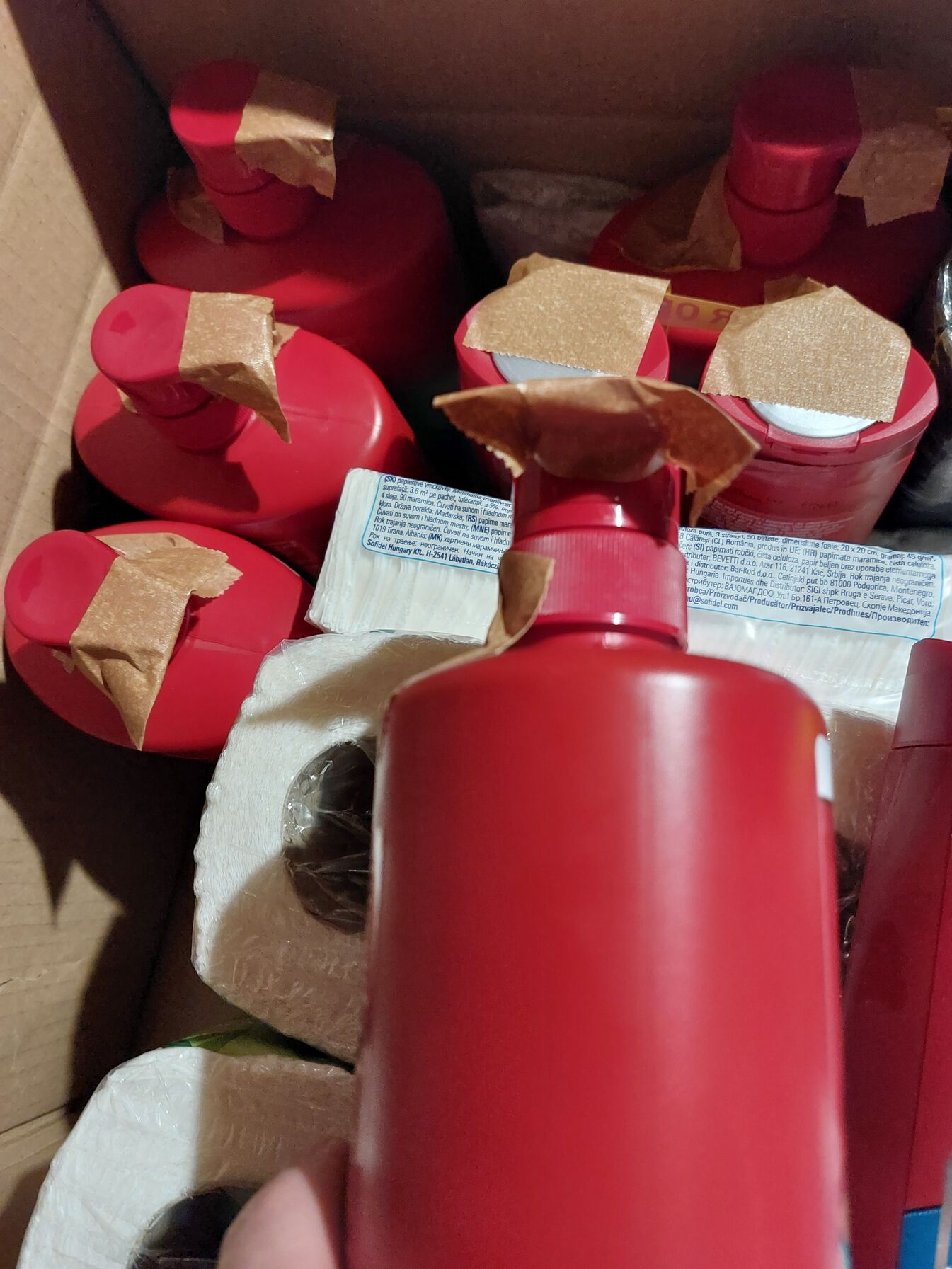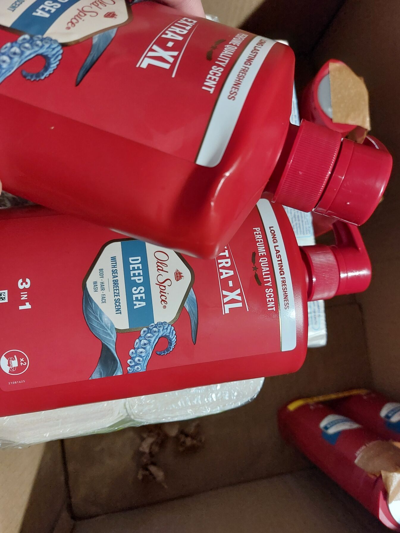 Volt sérülés a dobozon és egy leejtés is volt, mert kitöltő anyag ellenére az egyik Old Spice flakonja rendesen behorpadt.