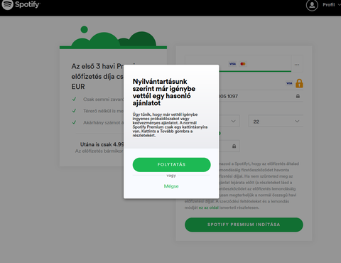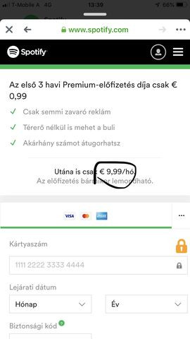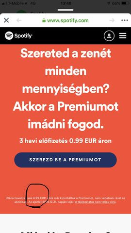 Előfizettem a Spotifyon egy három hónapos Prémium csomagra 0,99 EUR-ért. Nem nagyon használtam, el is felejtkeztem róla, de most letelt a 3 hónap és 4,99 EUR-t vontak le.