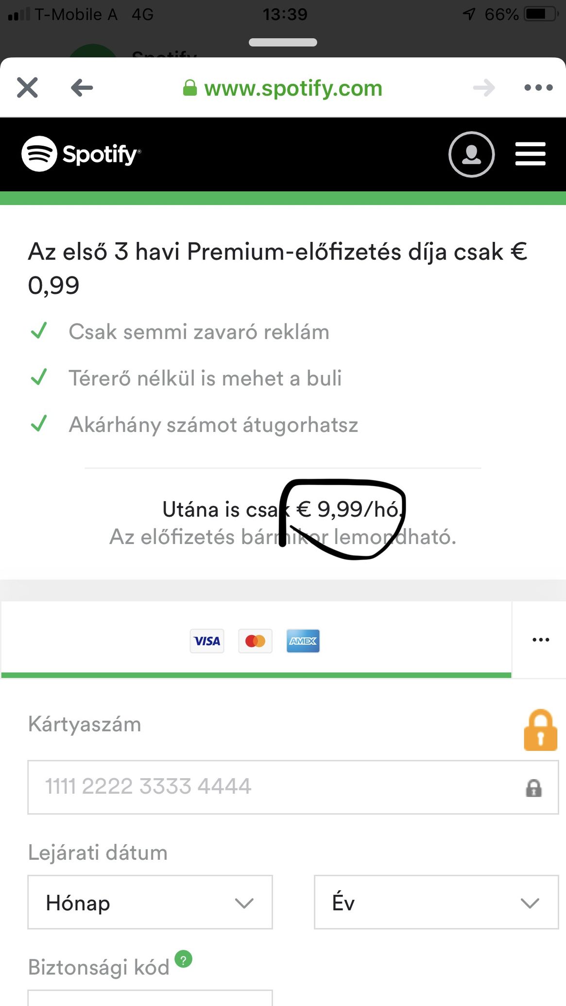 Új felhasználó vagyok, szeretnék előfizetni a prémiumra, csak lenne egy kérdésem elötte. Bedobja egyből, hogy most 0.99 € a 3 hónap, alatta írja hogy utánna 4.99 € havonta. Ez rendben is lenne, de mikor rányomok, és ahol a kártya adataim tudom megadni, ott meg már 9.99 € per hónapot ír a 3 hónap lejárta után.