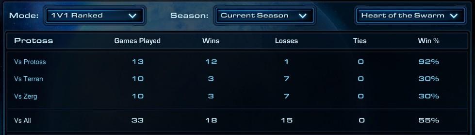 amúgy egy kicsit vicces az 1v1 statom, nem sokat játszottam 1v1-et mostanában, tegnap meg ma toltam párat :nem rusholok, nem tolok 2 base allint, az átlag meccs hosszam 18 perc, megpróbálok makro játékot hozni, de valahogy a végén mindig én kerülök ki vesztesen t vagy z ellen. p ellenfelek meg sokszor csak próbálnak valami 1 base pusht, azt simán fogom úgy hogy közben már expem is lent van, plusz esetleg egy kis oracle harass aztán megy is gg.