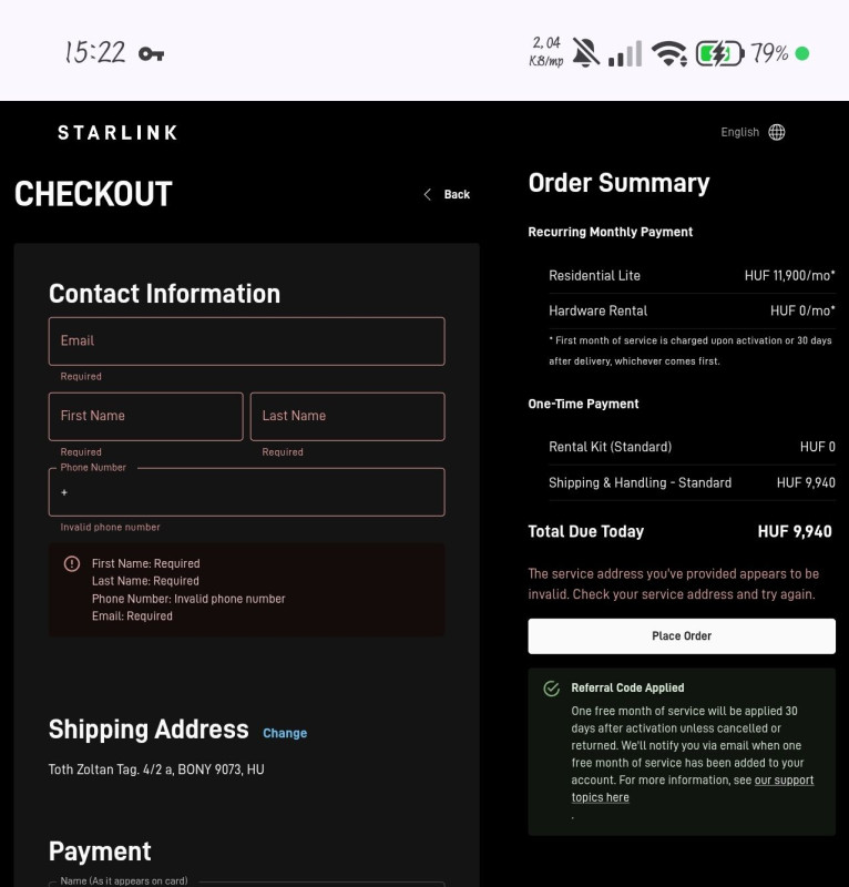 Szia mindenkinek esetleg valaki hozzáértő?rendeltem egy ingyenes starlink hardver pakot 12000ft havidíj.tegnap meg is jött , rendelésnél levonta elvileg az első havi díjat 10000ft erre ma küld egy emailt a starlink frissít sem a fizetési lehetőségemet mert nem tudják levonni a 12000ft havi díjat ,na ez hogy van? Köszönöm a választ ha valaki fel tudná vilagositani