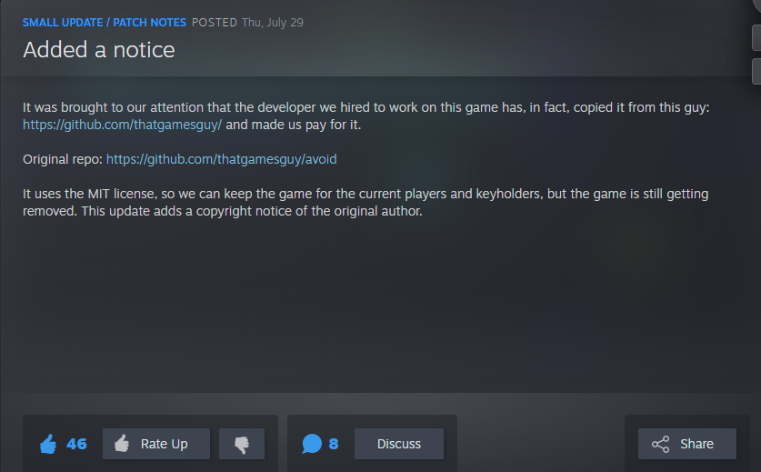 Aki még nem húzta be, az már nem is fogja, mert kiderült, hogy ezt a játékot egy developer ellopta valakinek a githubos projektjéből. Holott meg inkább mégis az történt, hogy ingyenes unitys tutorial assetet próbált meg (és sikerült is) eladnia annak a cégnek (?) akik feltették ezt a programot steamre.Közben meg a reddites posztban van egy ilyen furcsaság is: [link] - amit steamről töröltek.