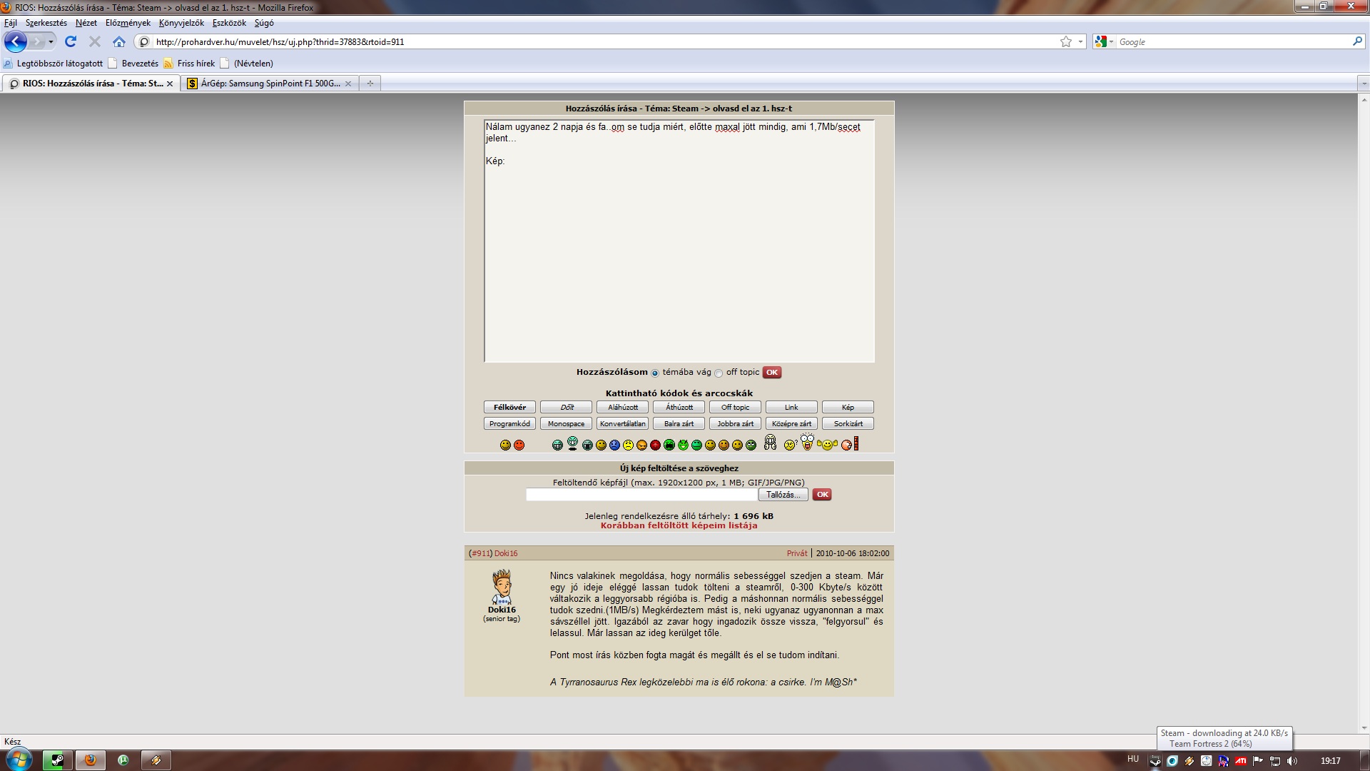 Nincs valakinek megoldása, hogy normális sebességgel szedjen a steam. Már egy jó ideje eléggé lassan tudok tölteni a steamről, 0-300 Kbyte/s között váltakozik a leggyorsabb régióba is. Pedig a máshonnan normális sebességgel tudok szedni.(1MB/s) Megkérdeztem mást is, neki ugyanaz ugyanonnan a max sávszéllel jött. Igazából az zavar hogy ingadozik össze vissza, "felgyorsul" és lelassul. Már lassan az ideg kerülget tőle.