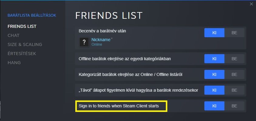 Nem tudom volt-e már róla szó.., ugye amikor megkaptuk ezt a chat/friends updatet akkor nem volt/látszólag kikerült belőle az az opció, hogy ne jelentkezzen be magától a friend listára amikor online indul a Steam.