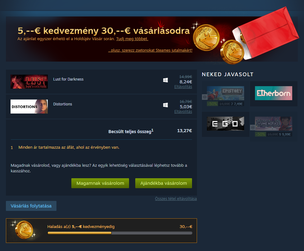 mindenesetre steam nálam alul maradt az epic games-es vásárral szemben, még akkor is ha ott nem vettem semmit, ott vettél 15€ vagy e felett valamit és kaptál 10€ kedvezményt (előrendelhető játékokra ill nemrég megjelent AAA játékokra ez eléggé megérte), itt meg úgy kell összekaparnod a 15ezer zsetont hogy 5€-ra beválthasd...