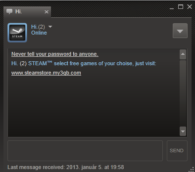 Most ingyen "ajándék" linkekkel próbálkoznak a csalók! Ha kapsz valakitől privát üzenetben egy linket, amin ingyen ajándékot kínál, ne kattints rá! A link 100%, hogy egy kamu oldalra visz, amivel ellopják a Steam accountodat! Az üzenet ismerőstől is jöhet!