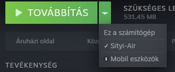 Én azt hiszem értem, miről van szó. Ha mindkét gép be van kapcsolva, akkor a Steam automatikusan felajánlja, hogy egyik gépről a másikra streameld a játékot. Elvileg a játék gomb mellett lesz egy lenyíló menü, ahol kiválaszthatod, hogy tulajdonképpen mit is szeretnél csinálni. (Sőt, itt a képen látszik is, hogy ezzel a játékkal például nem helyileg tudok játszani, hanem a másik gépről streamelni)