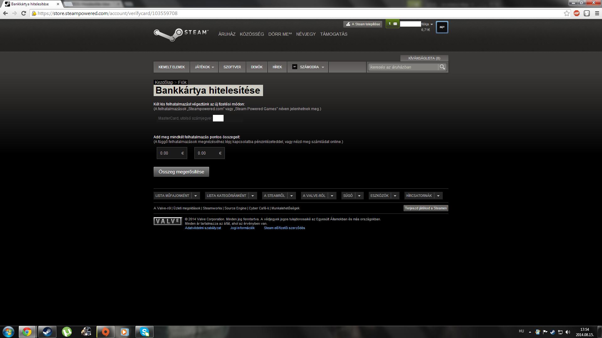 az a helyzet,hogy új bankkártyával fizettem,mert a másik lejárt és azt szeretné a steam,hogy hitelesítsem..