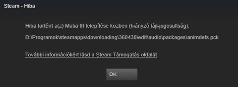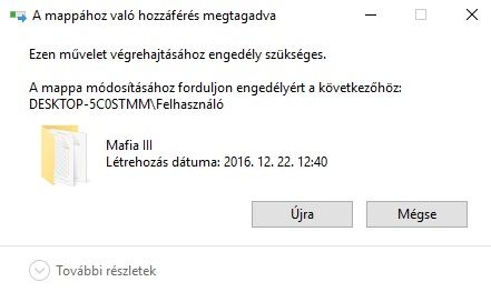 Most jelent meg a Mafia III új DLC-je, de nem telepítette a Steam, bármit is csináltam, ezért letöröltem a játékot és újra akartam rakni, de hibaüzenet fogad hiányzó fájljogosultság miatt, hasonló volt már régebben, itt tanácsolták, hogy futtassam rendszergazdaként, akkor az segített is. Jelenleg azonban ez is eredménytelen, állandóan ez az üzenet fogad mikor telepíteném: