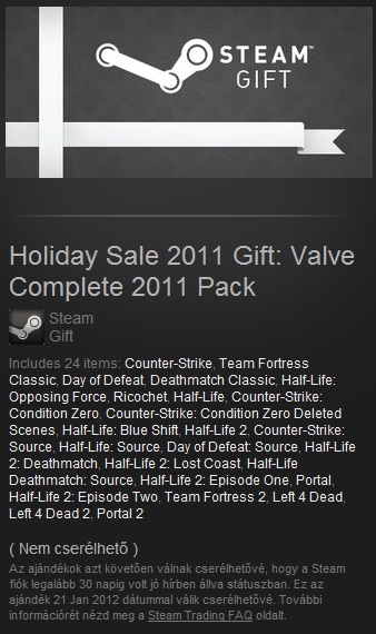Köszi. Való igaz, ahhoz képest hogy csak az ingyenes Steames feladatokat hajtom végre, már elsőre megkaptam a Valve pakkot. Nekem már megérte játszani, mivel csak az Orange Box volt meg és a többi (Portal 2, Left 4 Dead és hasonlók) még nem. Ezért kibontottam.