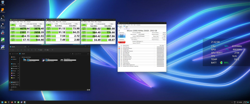 Micron 2400 2TB belső SSD, a második egy Samsung EVO Plus 256GB-os MicroSD a harmadik pedig egy USB-n csatlakoztatott NVMe SSD.