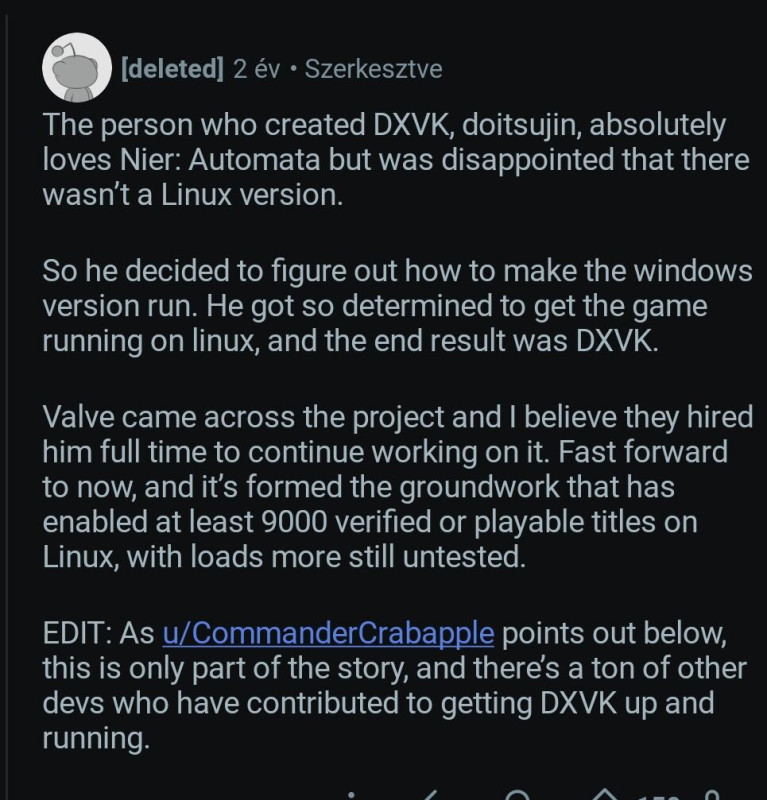 nier automatát tervezem én most, állítólag egy rajongónak köszönhejtük a dxvk-t és vele a linux gaminget.