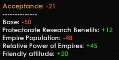 A jelenlegi játékomban robotokkal játszom (Rogue Sevitor), felettem egy másik robot empire van, akivel jóban vagyok, de szegény nagyon gyengécske. Szeretném őt beolvasztani háború nélkül, ha jól vettem ki, akkor ezzel az "Offer protective status"-al tudnám megtenni, de azt írja, hogy nagyon népes és emiatt nem lehet (egy piros x van az opció végén). Ilyenkor mit tehetek?