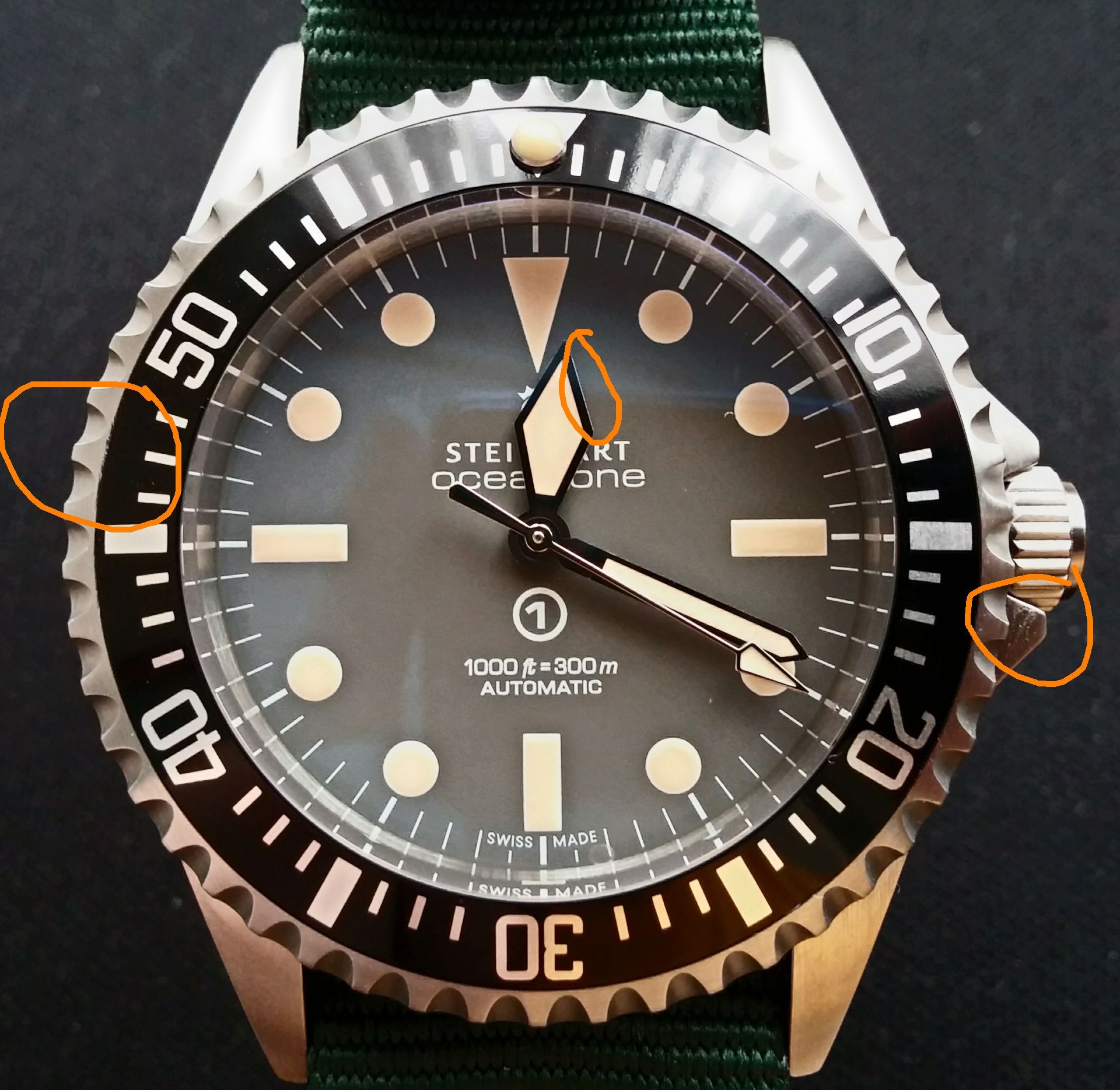 ) A korona logó gravírjában némi DNS vagy polírpaszta maradványt és csak nagyító alatt látható szálhúzás egyenetlenséget a korona gravírozott felületén. Ezen kívül semmi. Aminek centerben kell lennie az ott van, aminek illeszkednie kell az illeszkedik. Nekem az óra amúgy is tetszett ,de a megmunkálásra sem lehet panaszom. Elnézést a sok képért és a minőségükért.