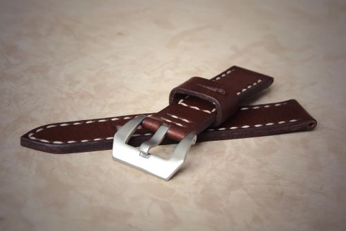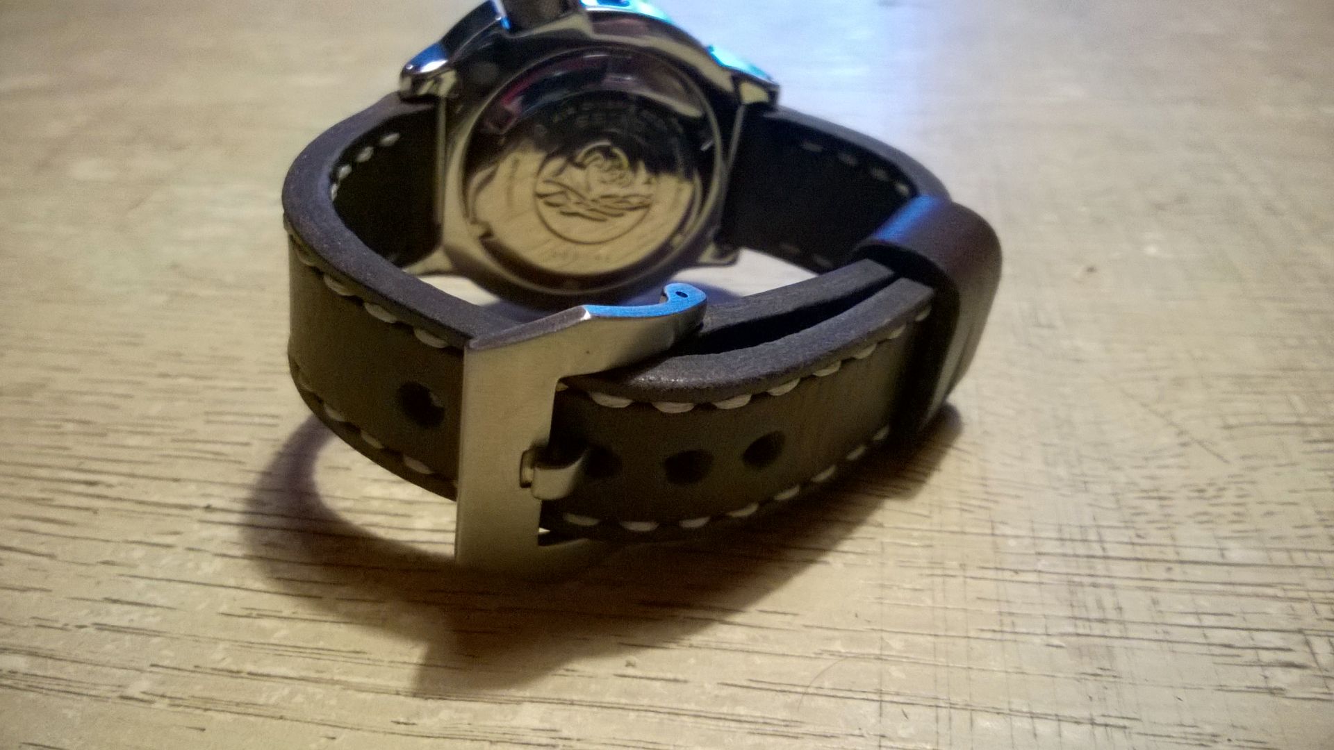 A 22/18-as bőrszíj szépen varrott, kellően vastag, bár érzésre minta kevés lenne benne az anyag (a cérna is vékony, meg kicsit nyikorog is), itt eleve cserét terveztem, 22/20-as Hirsch Libertyre.
