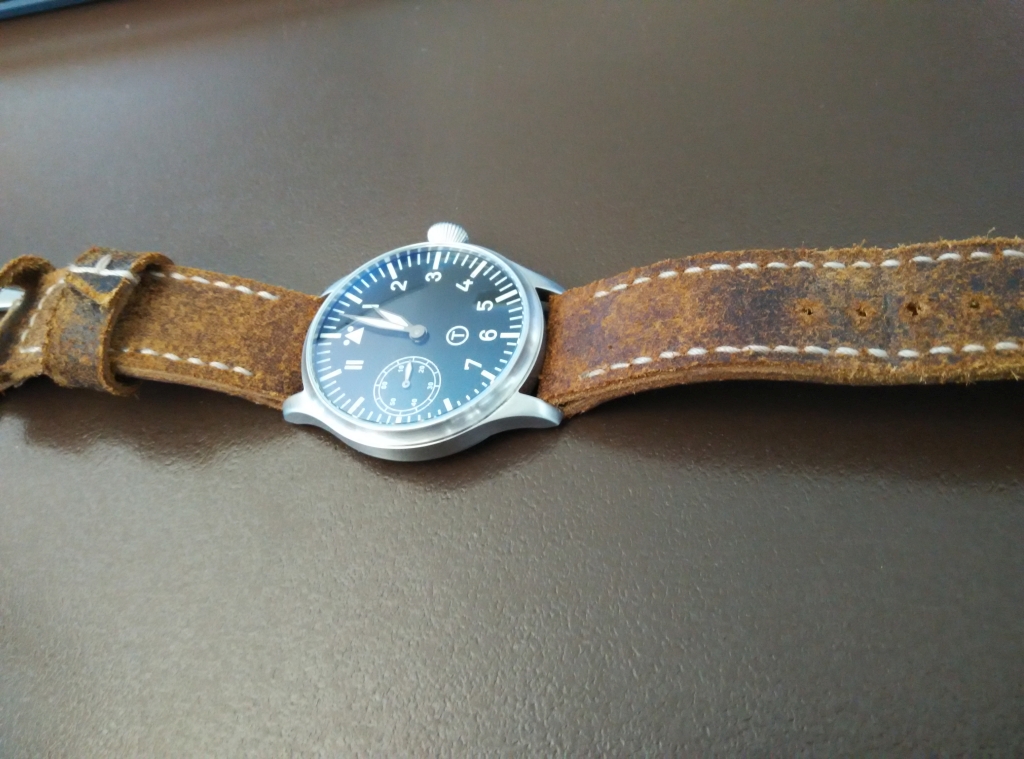 A kékített mutatókészlet úton van már.Parnisként kezdte a pályafutását, a tokot szálcsiszoltam (kézzel); egyedi számlapot kapott, az A6497 helyett pedig egy vintage unitast zsebórából; a szíjat vasárnap készítettem neki (mbstraps).