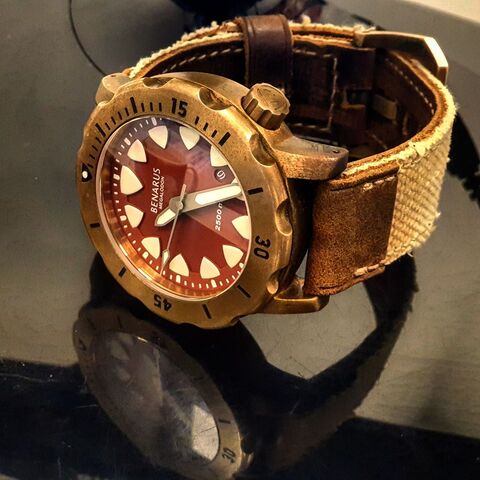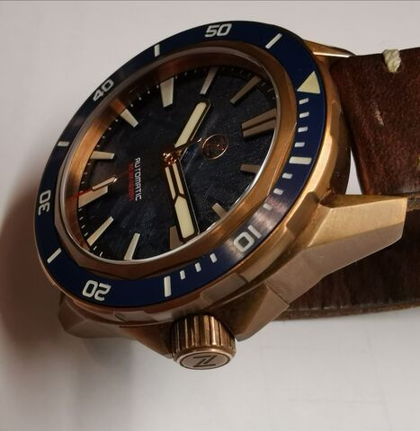 Régóta szerettem volna bronz tokos órát, zelos-t is nézegettem, különösen tetszett, hogy nem homage-ket gyárt, saját elképzeléseik vannak. A meteoritos vonal meg különösen tetszett. Viszont sokalltam az árukat, és a honlapjukon a képek sem az igaziak. Ekkor rátaláltam egy másik oldalra, ahol olcsóbban árulták az óráikat, és részletesebb képeket is tettek közzé. [link] Na itt a kék meteoritos számlap, a rengeteg letörés a tokon, plusz még a zafír üveg körül a ráma szögletessége teljesen elvarázsolt.