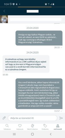 Igen beleálltam, mert kért ajánlatot, ajánlott egy árat, készítettem egy ajánlatot a számára és se nem utasította el, se nem fogadta el, se nem semmi. Nem kérdezett semmit. Az szerintem nem volt nagy beleállás, hogy leírtam mit gondolok. Erre kaptam a leb...át, hogy milyen 30 eur postaköltség, akkor ő következtetett, hogy az óra nincs is Magyarországon... bla bla bla. Meg nem kérdezte volna, csak következtetett. Ha árulok egy órát, mint magáneladó, a Chrono24-nek minden adata megvan rólam. A hirdetés feladásakor bizonyítanom kell, hogy nálam van személyesen az óra (2 db általuk meghatározott időbeállítású képpel). Azt sajnálom, hogy magánszemélyek esetében miért nincs visszajelzési lehetőség a vevő oldaláról, valamint miért nem jelzi ki, hány sikeres adás-vételt bonyolítottam már le rajtuk keresztül. Ha ezek az adatok (a csatlakozási dátumon felül) szerepelnének az eladó neve mellett, könnyebben lehetne bízni a magáneladóban. Szerintem. Remélem javítják.