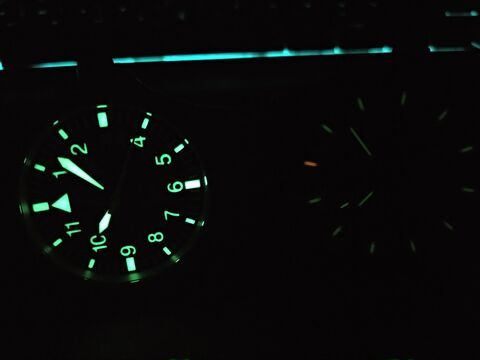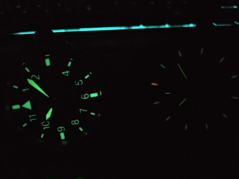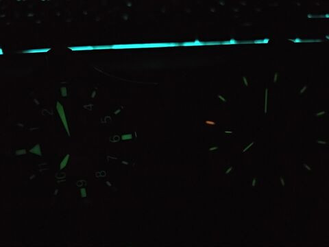 Éjszakai fotózásban gyenge a telefonom, 10 perc után már nem tudtam normális képet lőni, de talán látszik a lényeg: kb. 6 percig tart a C1-es (asszem C1-es) SuperLuminova előnye. Bár kép arról már nincs, de 10 perc után már egyértelműen a trícium vezetett, pedig másfél óra után is le lehet olvasni a C1-et (talán tovább is, de nem teszteltem).