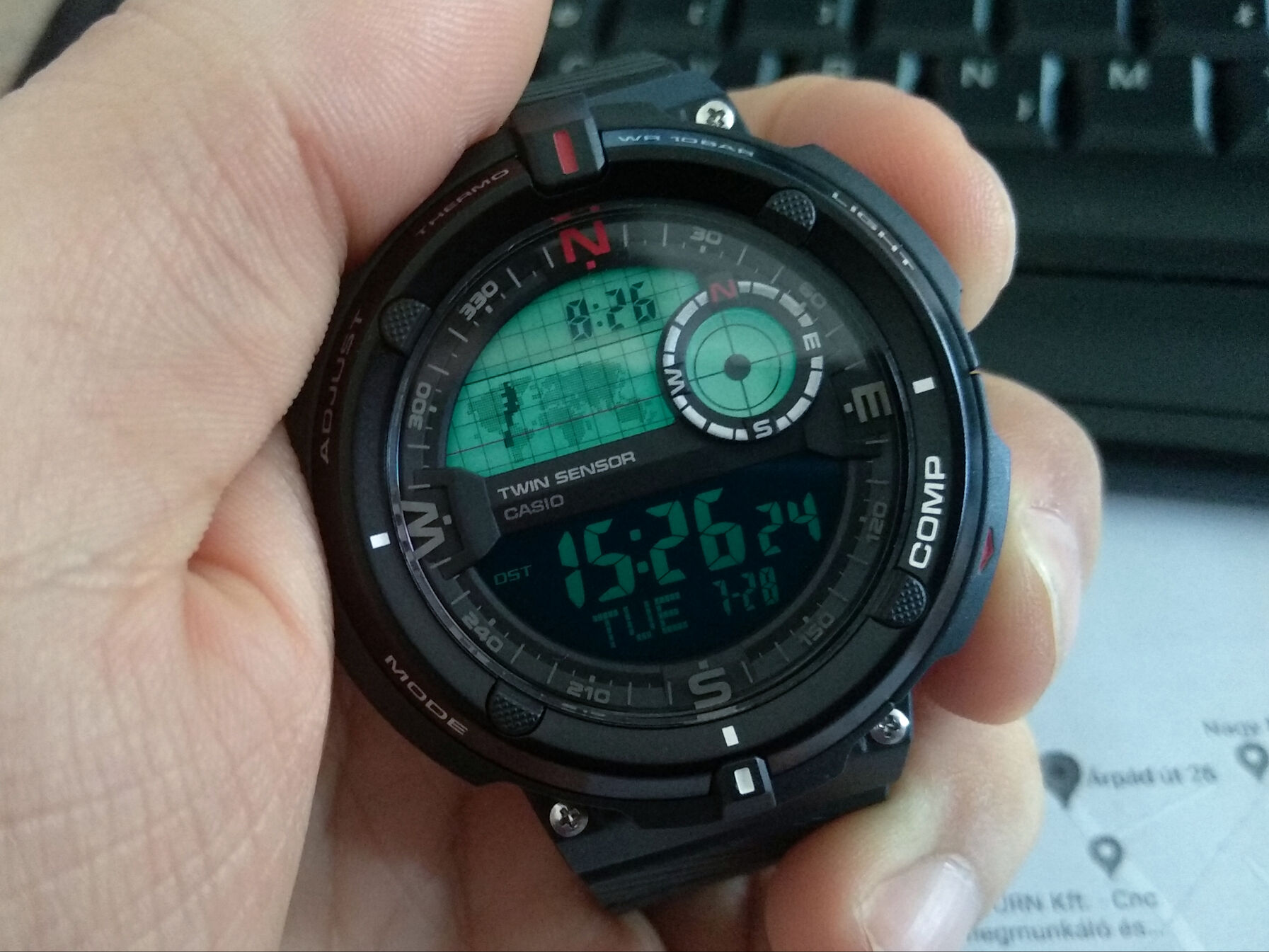 Az iránytű viszont szeret tévedni kicsit, ±15 fok van megadva pontosságként, az szerintem helytálló, szal arra jó, hogy megmondja, kb. merre van észak.
