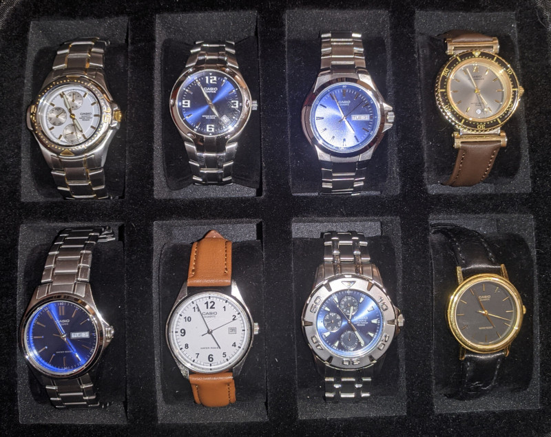 ABX-53 órám van több mint 25 éve napi használatban, persze nem ez van a fotón.A képen ABX-600, ABX-610 ezüst színű, ABX-610 arany színű, ABX-620 van, második sorban pedig ABX-630, ABX-631, WVA-200, és ABX-53.