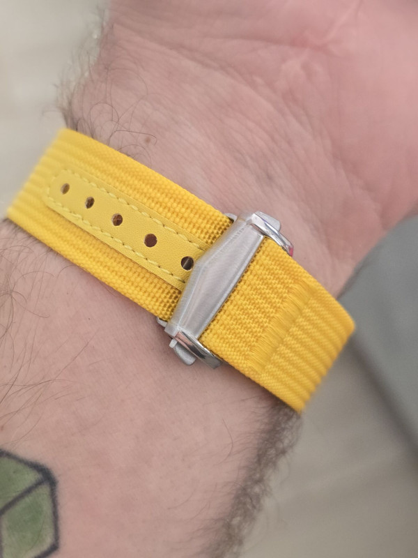 Egy kisebb vagyon volt a gyári fém szíj rá, de már meguntam a folyamatos bőr szíj cseréket. Mindennapi viseletre átálok erre. Az első nap kellemes csalódás volt. Szinte nem is érzem a különbséget. Súlya alig van neki.