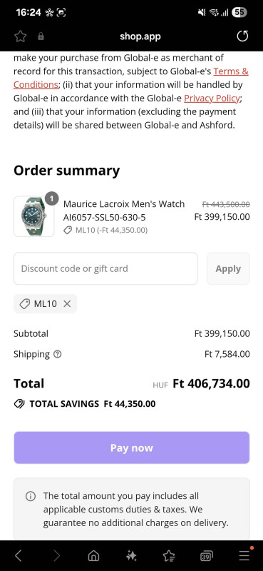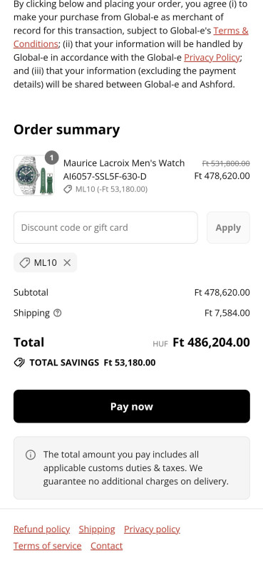Ashford -ról rendelve megváltozott a vásárlás menete. Felismeri az ország régiót, forintban adja meg az árat és bele kalkulálja az áfa és vám költséget, garantálva, hogy a feltüntetett ár a végső ár és egyéb költség nem terheli. A ML órák még így is onnan a legjobbak árban. Az Aikon venturer 38mm van náluk kaucsuk szíjas és fém+ kaucsuk változat is.