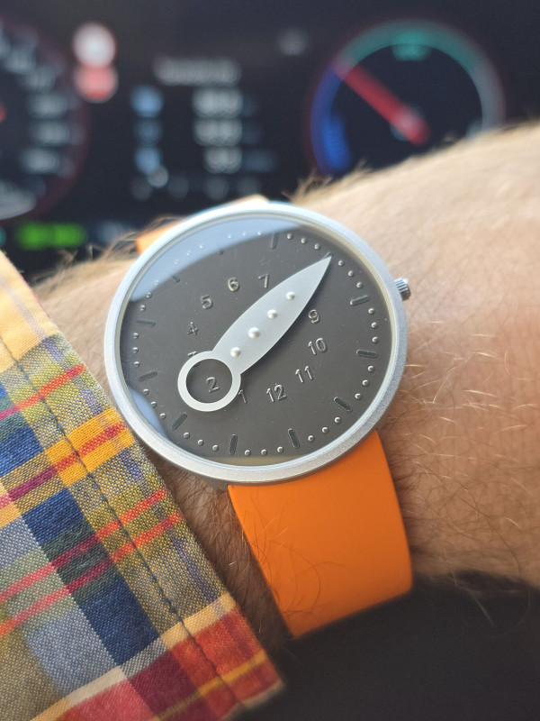 Ez az óra tulajdonképpen csak egyetlen mutatót használ, ami úgy működik, mint bármelyik óra kis (óra)mutatója. A számlapon két szám között negyedórás beosztás van, tehát pontosan ugyanannyit jár egy óra alatt, mint más órákon a kismutató. A különlegesség az, hogy a mutató túlsó végén van egy kör, ami az aktuális órát számmal is mutatja – mintha a számlap 180 fokkal el lenne forgatva.