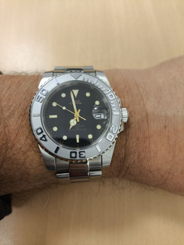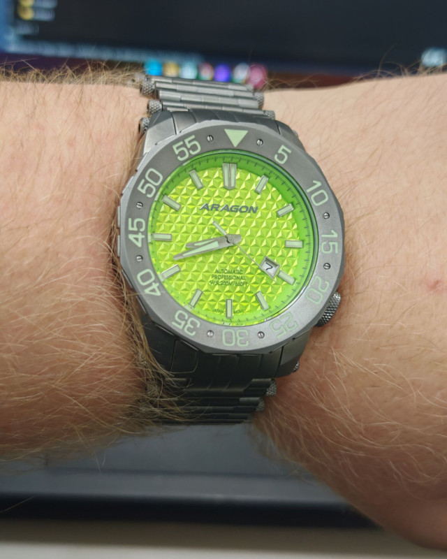 Nem tudom mennyire ismert márka az Aragon, de az én csuklómon ahogy korábban is írtam a legtöbb óra pici, szinte gyerek méret, ezért is kerültek nálam fel a kedvencek közé. A lenti darab 50 mm-es, igazából a hátlapon látszik, hogy mennyire méretes egy sima automatához képest. A cég egyébként maximálisan korrekt volt, írtam nekik, hogy a megadott méretben kicsi lesz a csuklómra a fém szíj, kérték, hogy küldjem el a pontos méretet és kipótolják ingyen. Így is lett. Súlyban is combos. Napi hordásban gondolkozom, a magassága és a színe miatt öltönyhöz kicsi erős lenne.