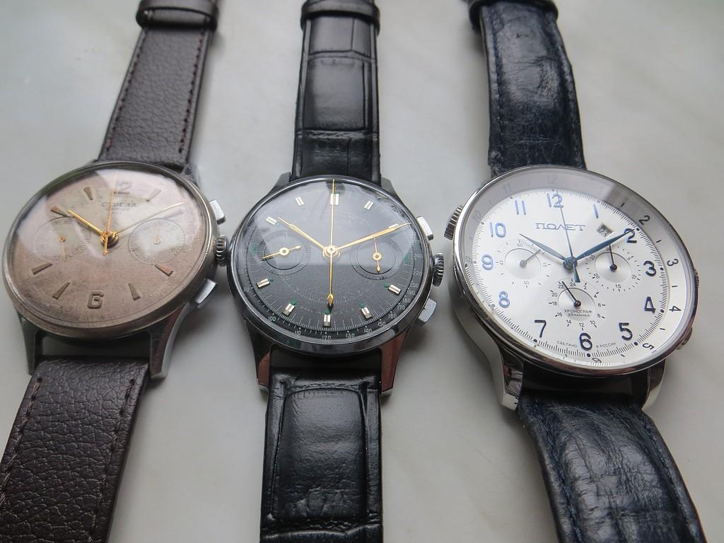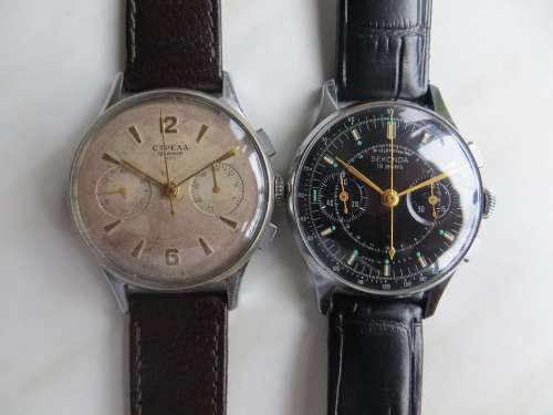 Régóta szerettem volna egy első óragyári 3017-es Poljot CTPELA-t, csak hát nem olcsó. Most végre olyan szerencsém lett, hogy rászaladtam, sőt, egyből kettő lett, ugyanis csak párban volt eladó. A bal oldali még a legelső számlappal készült, ez kicsit viseltes, de kaptam hozzá egy szép számlapot, a jobb oldali viszont hibátlan, szinte hordatlan: