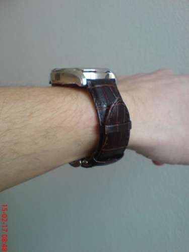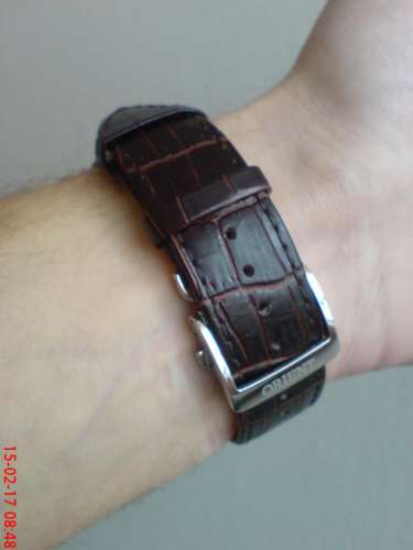 A másik, hogy azt vettem észre, hogy szinte teljesen felhúzva késébe megy át, de félig felhúzva illetve az alatt meg siet valamennyit, még egyelőre nem tudom, hogy mennyit, mert első hete hordom. A bőr szíja baromi kemény, de már valamennyivel puhább, mint volt. Fura a szíj, mert a bújtató felém van, érdekes megoldás. -