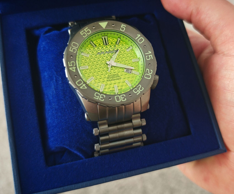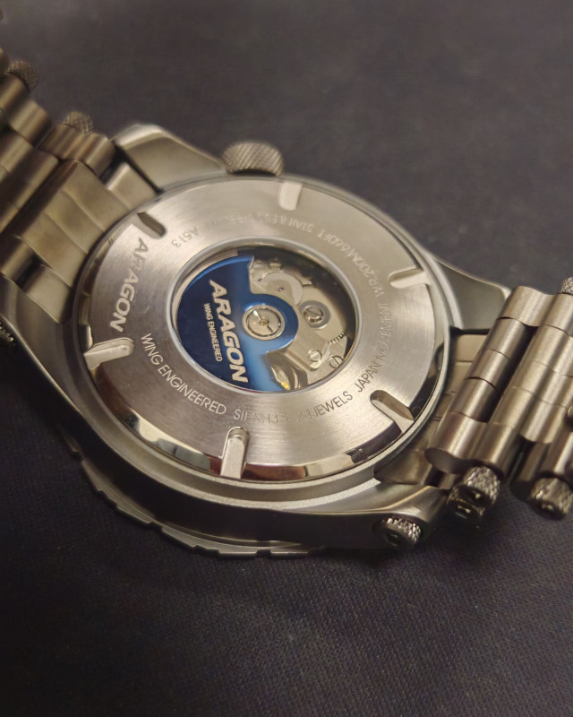 Nem tudom mennyire ismert márka az Aragon, de az én csuklómon ahogy korábban is írtam a legtöbb óra pici, szinte gyerek méret, ezért is kerültek nálam fel a kedvencek közé. A lenti darab 50 mm-es, igazából a hátlapon látszik, hogy mennyire méretes egy sima automatához képest. A cég egyébként maximálisan korrekt volt, írtam nekik, hogy a megadott méretben kicsi lesz a csuklómra a fém szíj, kérték, hogy küldjem el a pontos méretet és kipótolják ingyen. Így is lett. Súlyban is combos. Napi hordásban gondolkozom, a magassága és a színe miatt öltönyhöz kicsi erős lenne.