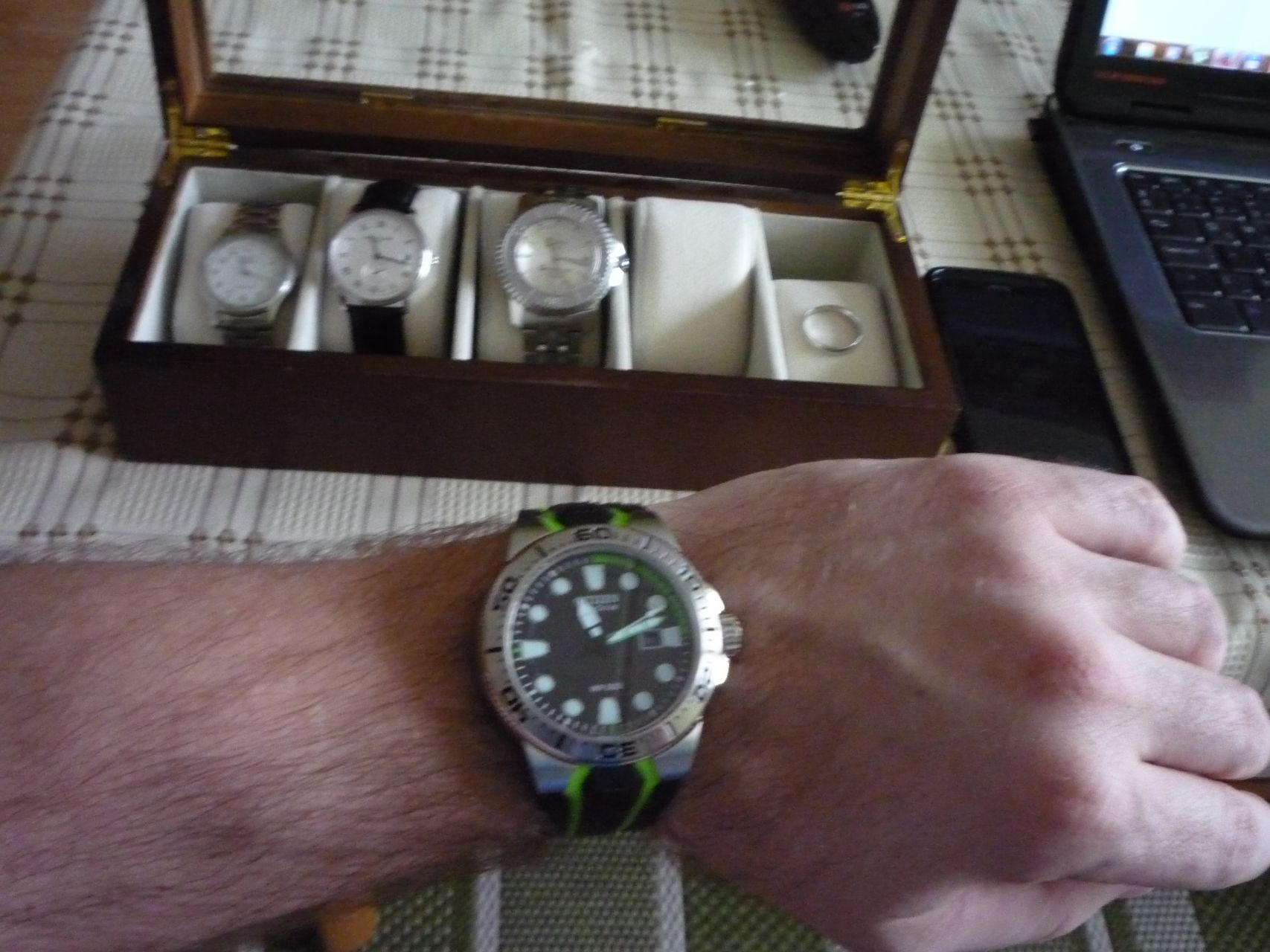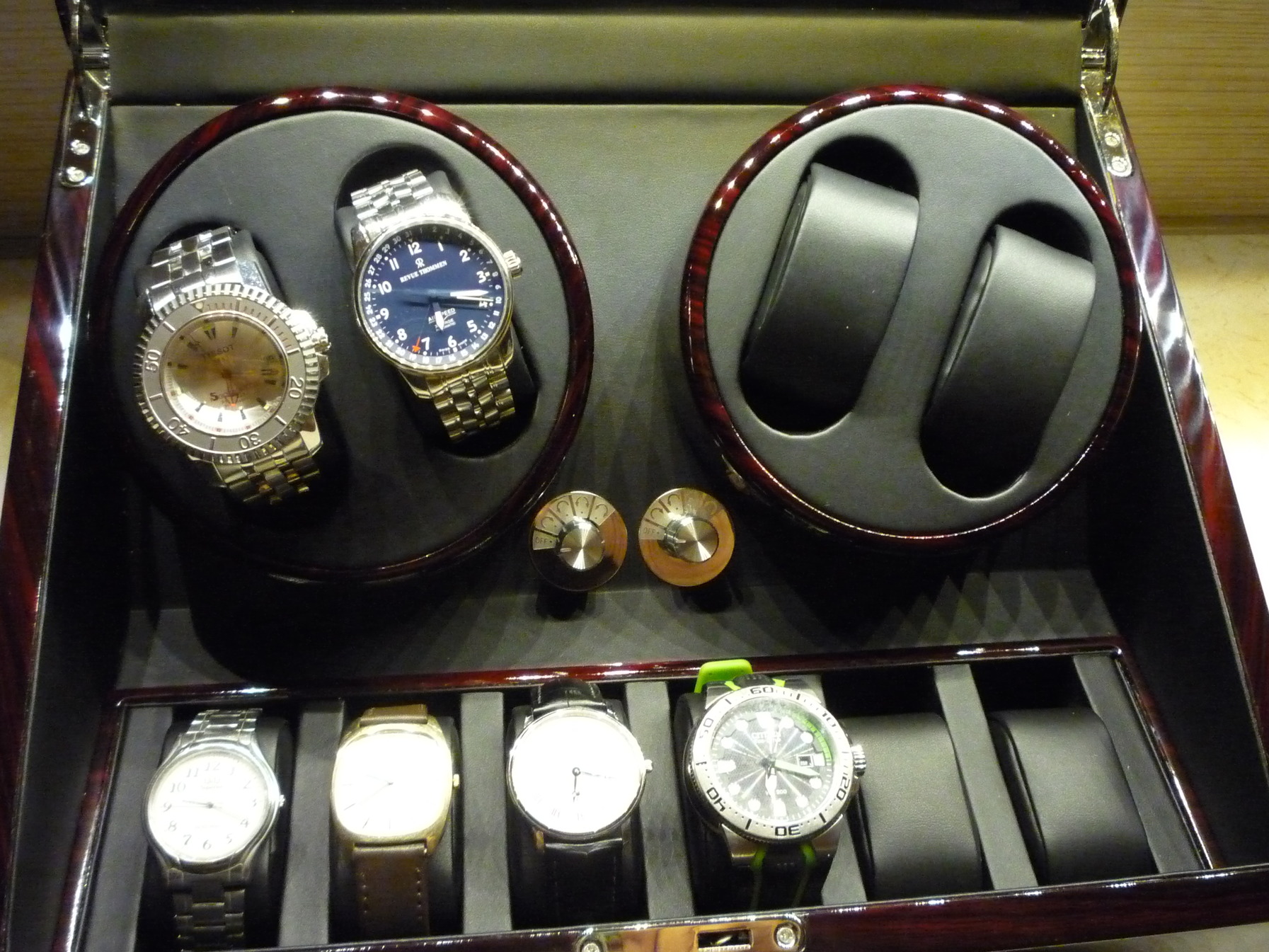 Mai nappal felavattam életem első óraforgatóját. A méretein kissé meglepődtem, de nagyon szépen mutatnak benne az órák. Egyúttal kérdezném is, hogy melyik program az ideális? Első körben azt választottam, ami 2 percig órajárással megegyezően forog és 6 perc szünet, utána meg ellenkezőleg 2 perc forgás és újra 6 perc szünet. Képek minőségéért előre is elnézést.