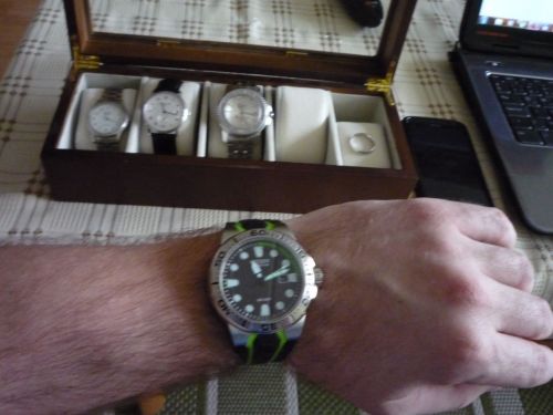 Nem rég ment el a postás és meghozta életem első automata óráját. Évek óta sóvárogtam egy ilyen után és most itt van. Le a kalappal az eladó előtt, szinte makulátlan óra. Egyedül a csaton van pár nagyon apró hajszálkarc. Doboz, papírok, garikártya + két pótszem mellé. Egyet még így is ki kell vetetnem,mert a mutató ujjam befér még a szíj alá és így csúszkál a csuklómon. Íme pár kép a kicsikéről: