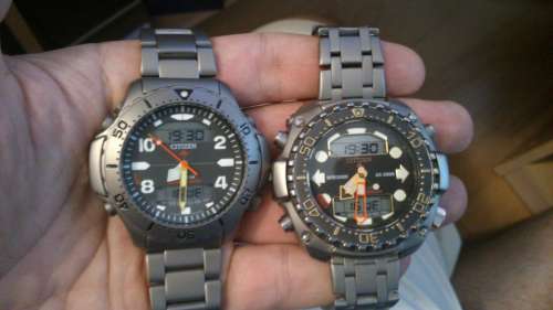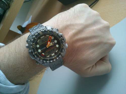 Hát ez már egy régi modell, amit nem is nagyon lehet kapni még használtan sem, de ha mégis, akkor drágább mint egy új, mivel ritka darab. A pontos típusát nem tudom,de 300 méterig vízálló, titán tokozás és 5503 quartz szerkezetes. Citizen Professional diver's 300m, a kilencvenes évek elejéről, úgy 91 körül. És volt egy durvább változat is ami 800 méterig vízálló, az volt az AJ0080-08E és hasonlított a 300m-esre, de szerintem nem volt olyan szép.