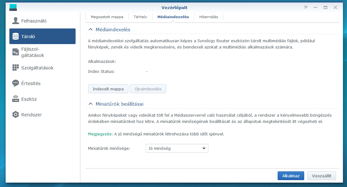 A routeren nem ismerem, hogy milyen de a NAS -on az alkalmazásoknál fel vannak sorolva alkalmazások (Média szerver van a routeren ezekből csak) és az állapotnál : Kész . Mivel Synology- Synology csak gondolom, hogy itt is úgy kéne lenni. Nálad a képen ezek nincsenek. Bár azt, se tudom, hogy alkalmazás nélkül is megy e az indexelés. Bár a kép alapján beállítva sincs mappa indexelésre vagyis nálam sincs és akkor nem él az újra indexelés gomb se csak az indexelt mappa amin vbe lehetne előbb állítani.