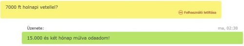 Na ekkor ráírtam, hogy örülök, hogy érdeklődik és meg szeretné venni, de ha tényleg érdekli, akkor kérem alássan, ne én hívogassam telefonon, hanem hívjon ő. Bármikor hívhat reggel 6-tól este 10-ig utána már nem illik. Azóta nem hallottam/olvastam felőle.Olyan hogy meghív egy sörre, de a kocsmáig a tömegközlekedést én fizessem.
