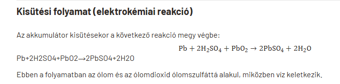 Én csak erre akartam rávilágítani.Töltéskor a folyamat megfordul, külső energia (töltőáram) hatására az ólom-szulfátból ismét ólom lesz az egyik elektródán és őlom-oxid a másikon.