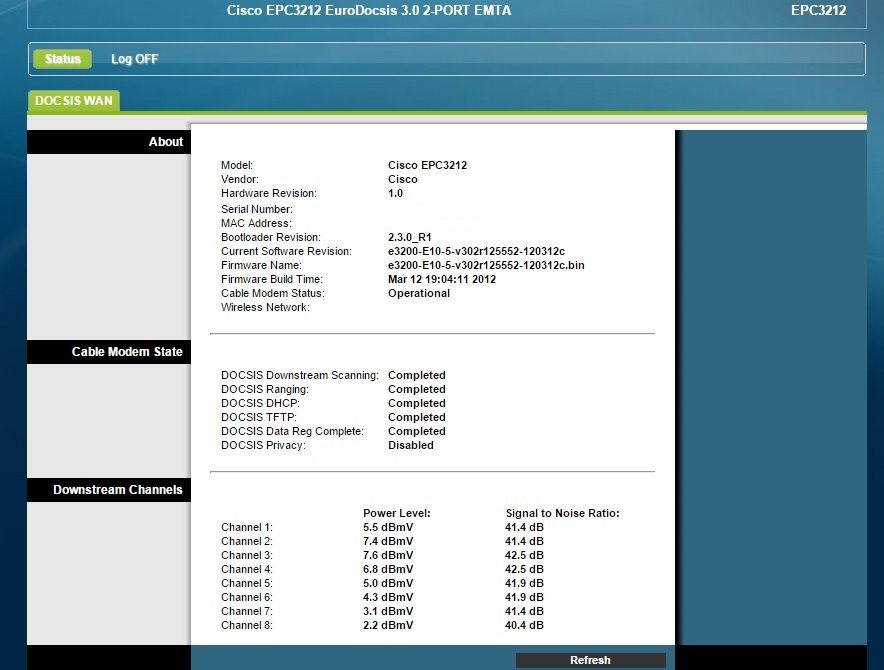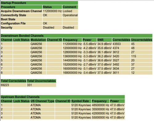 Szép ügyesen szét is hullott a net este óta. Folyamatosan egyre harmatosabb lett, hullottak a csatornák. A 8/4-ből 4/2 lett utána meg 1/1. Letöltési power -6.8dBmV SNR 36dBmV Feltöltési power 52.5dBmV