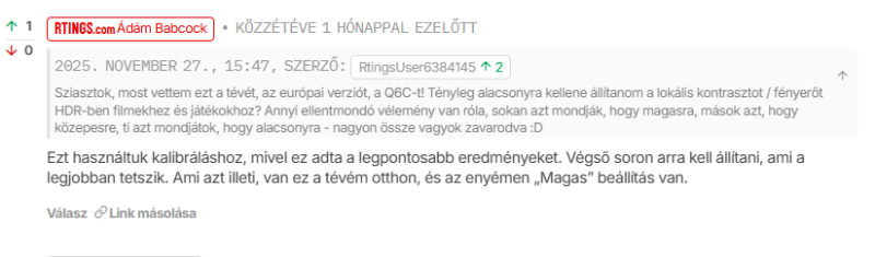 Ugyanis a TV kalibrációkat 6500K-ra csinálják és a C6K-n a Meleg 5, tehát a legmelegebb beállítás is ehhez van közel, nem a 4500K-hoz, tehát túl melegre nem lehet állítani a TV-t. Az már más kérdés, hogy a 8000K-hoz szokott szemnek a 6500K túl melegnek tűnik az első pár napban, ez így szokott lenni. -