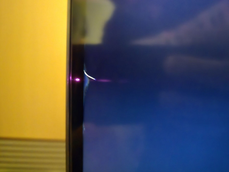 Jobban megnéztük bekapcsolt állapotban és a képernyő bal szélén találtunk egy ilyen furcsa jelenséget. Felületi sérülés nincs, tehát valahol az üveg mögött van egy sérülés. Ez okozhatja akár a hibát. Hívjuk a Telekom-ot, illetve beregisztrálom a TV-t a TCL oldalán.