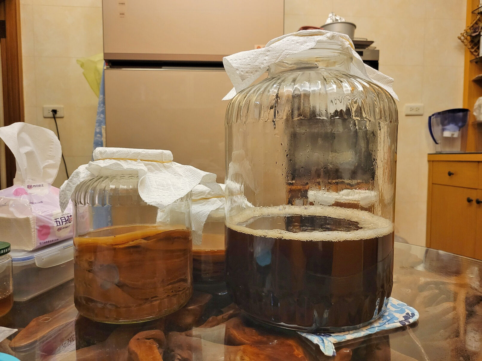 Most csak annyi, hogy újabban gyümölcslével csináltam a kombuchát "valódi" gyümölcshús helyett. Sokkal gyorsabban "beérik" (eléri a kívánt bubisságot), szinte úgy kell kibontanom az üveget, mintha pezsgő lenne. Legutóbb szőlőlével meg fahéjrúddal próbálkoztam, kicsit olyan lett, mintha szénsavas forralt bort innék.