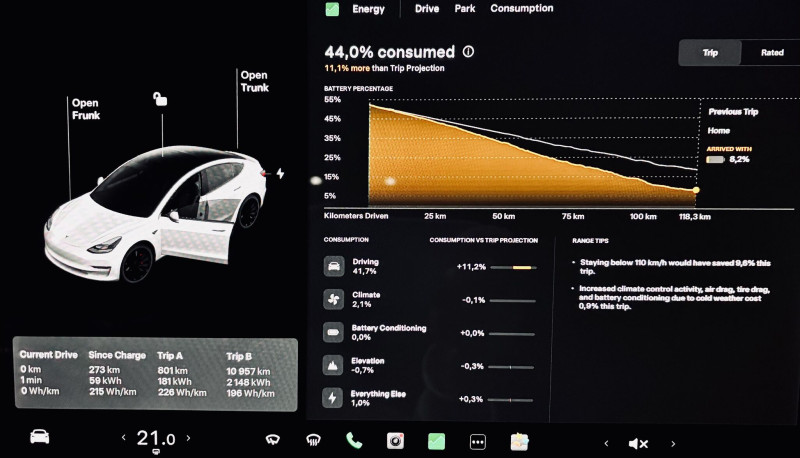Használatról meg ez sokat mutat pl, Model 3 Perf, mai fogyasztásom, pálya 120-130-al egyik irányba (nagy volt a köd és nem siettem), vissza 150 körül, maradt még 8%, pont elég biztonsági tartalék, nem is nagyon szoktam alá menni. Illetve látsz egy elmúlt 11e km-es átlagot is. Én nem vagyok egy óvatoskodó, megyek vele ha lehet.
