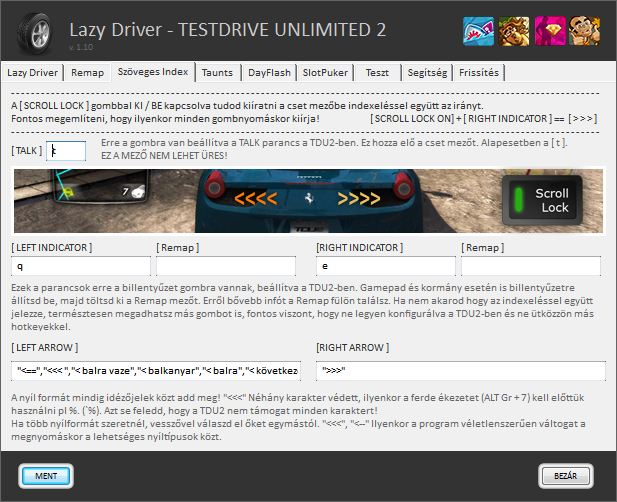 Slotgép előtt ülve nyomkodja/rángatja 5 másodpercenként míg kikapcsolod. A NumPAD * átírható a státusz szövegekkel együtt.Tömörebb javított, kód, testreszabható már a TALK gomb, csak a TDU2-ben aktív már. Verzió szám!