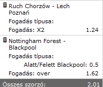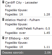 Cardiff - Leicester Cardiff (H) vagy Leicester (V) jut tovább 1.14 / --- / 3.65 HEz így 2.02 ha jól számolom.